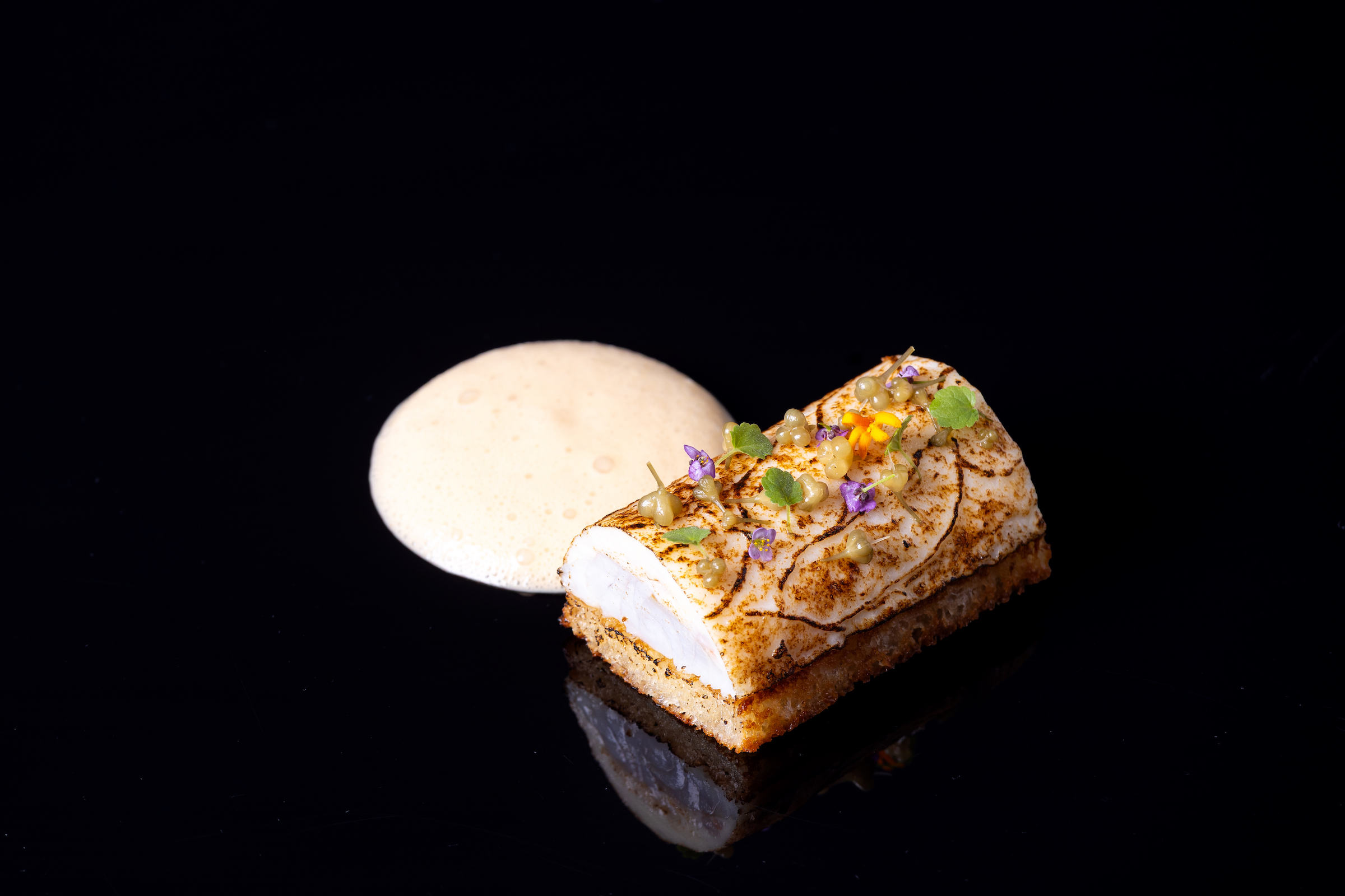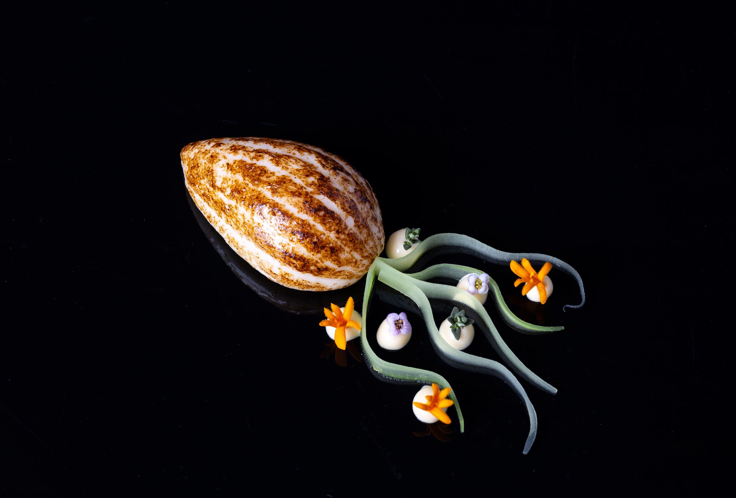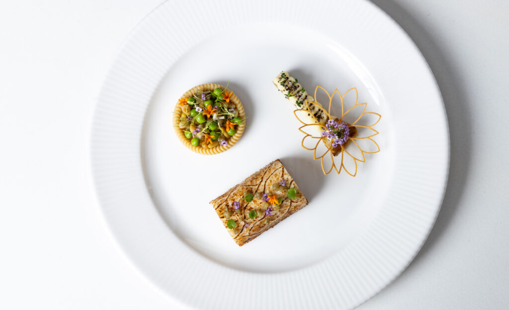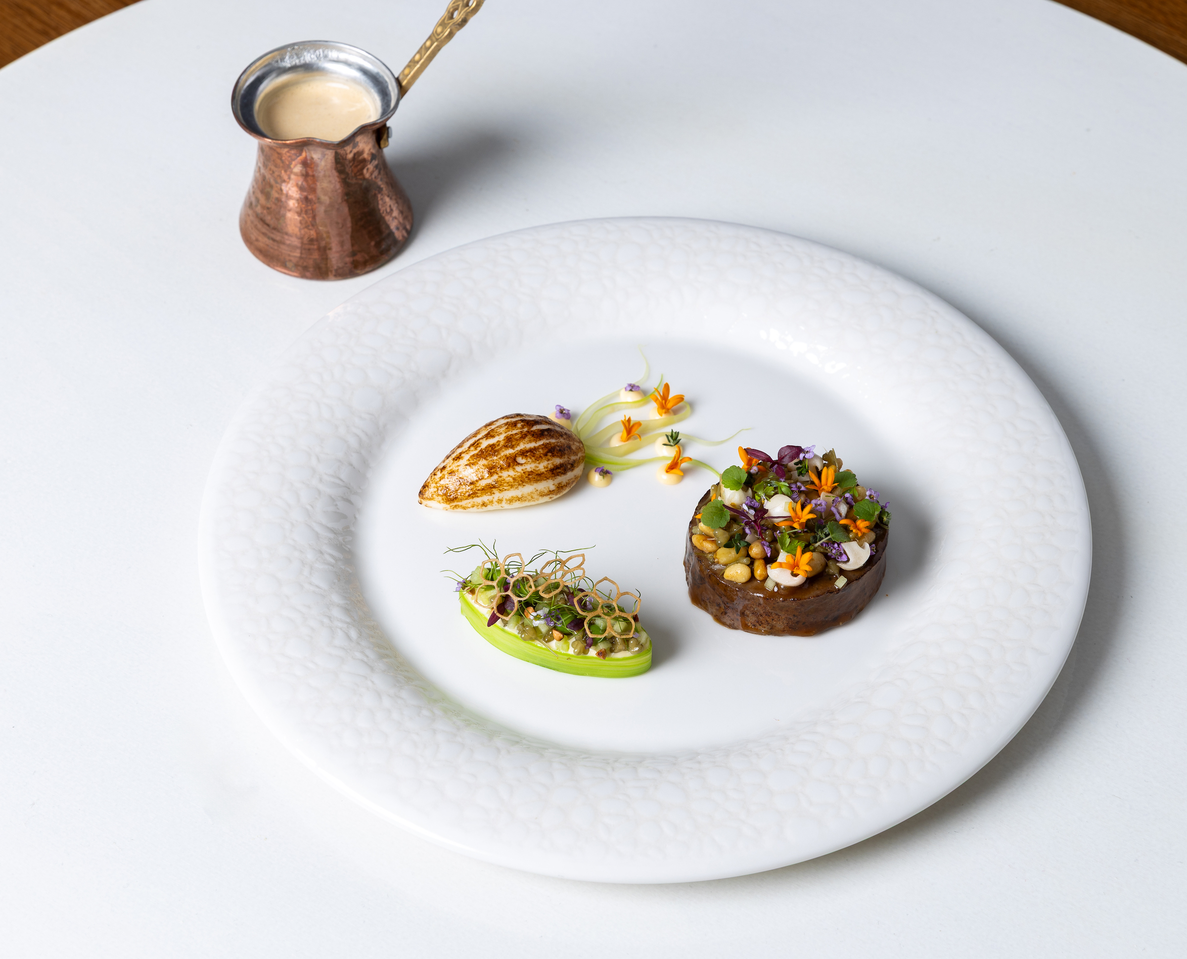Téma tanier (Plate): hovädzia sviečkovica z camargského býka, sépia, aioli emulzia a sezónna zelenina