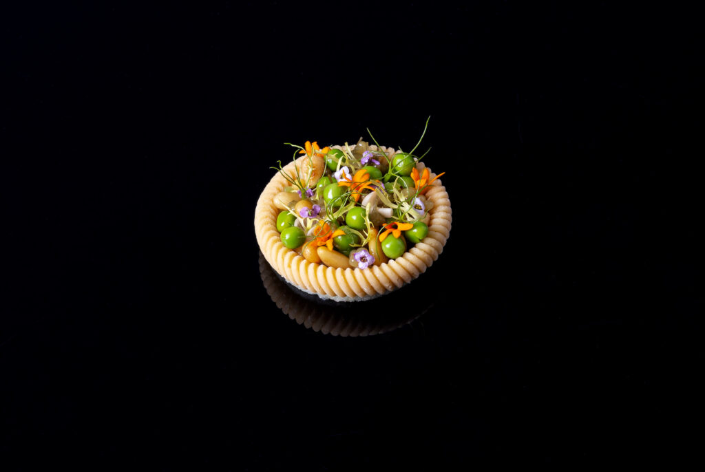 Téma misa (Platter): štítnik červený, cícer, fialová artičoka a omáčka z morského ježka