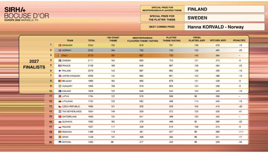 Výsledky opäť potvrdili dominanciu severských krajín, ktoré v posledných rokoch systematicky investujú do prípravy svojich Bocuse d’Or tímov a patria medzi najúspešnejšie gastronomické školy sveta.